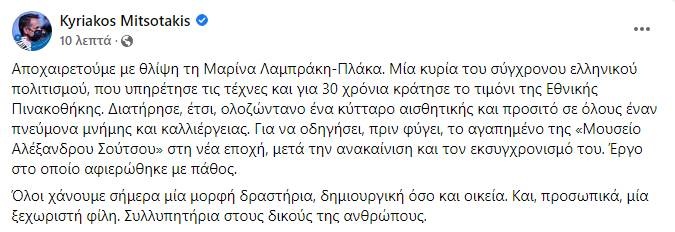 «Αποχαιρετούμε με θλίψη τη Μαρίνα Λαμπράκη-Πλάκα. Μία κυρία του σύγχρονου ελληνικού πολιτισμού, που υπηρέτησε τις τέχνες και για 30 χρόνια κράτησε το τιμόνι της Εθνικής Πινακοθήκης.