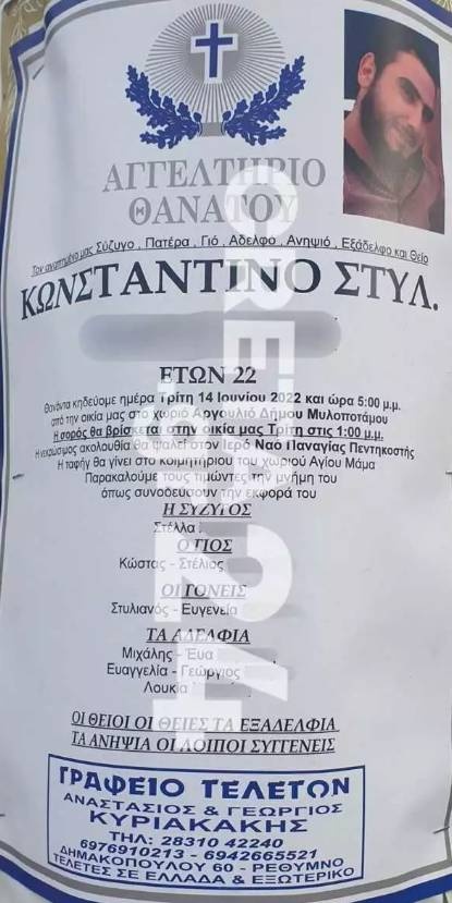 Σε βαρύ κλίμα η οικογένεια, οι συγγενείς και οι φίλοι, είπαν το απόγευμα της Τρίτης, το τελευταίο αντίο στον 22χρονο Κωστή Χαριτάκη, ο οποίος βρήκε μοιραίο θάνατο 44χρονο συγχωριανό του το απόγευμα της Κυριακής στον Αργουλιό Μυλοποτάμου.