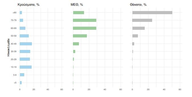 Οι εισαγωγές νέων ασθενών COVID-19 στα νοσοκομεία της επικράτειας είναι 176 (ημερήσια μεταβολή +31.34%). Ο μέσος όρος εισαγωγών του επταημέρου είναι 130 ασθενείς. Η διάμεση ηλικία των κρουσμάτων είναι 37 έτη (εύρος 0.2 έως 112 έτη), ενώ η διάμεση ηλικία των θανόντων είναι 80 έτη (εύρος 0.2 έως 106 έτη).