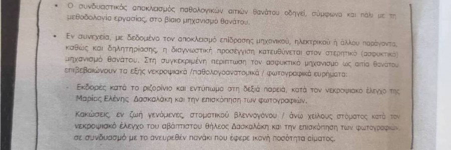 «Ο συνδυαστικός αποκλεισμός, παθολογικών αιτιών θανάτου, οδηγεί, σύμφωνα και πάλι με τη μεθοδολογία εργασίας, στον βίαιο μηχανισμό θανάτου. Εν συνεχεία, με δεδομένο τον μηχανισμό επίδρασης μηχανικού, ηλεκτρικού ή άλλου παράγοντα, καθώς και δηλητηρίασης, η διαγνωστική προσέγγιση κατευθύνεται στο στερητικό ασφυκτικό μηχανισμό θανάτου. Στη συγκεκριμενη περιπτωση, τον ασφυκτικό μηχανισμό ως αιτία θανάτου επιβεβαιώνουν τα εξής νεκροψιακά/παθολογοανατομικά/φωτογραφικά ευρήματα: