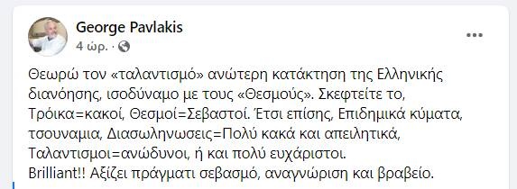 «Θεωρώ τον «ταλαντισμό» ανώτερη κατάκτηση της Ελληνικής διανόησης, ισοδύναμο με τους «Θεσμούς». Σκεφτείτε το, Τρόικα=κακοί, Θεσμοί=Σεβαστοί. Έτσι επίσης, Επιδημικά κύματα, τσουναμια, Διασωληνωσεις=Πολύ κακά και απειλητικά, Ταλαντισμοι=ανώδυνοι, ή και πολύ ευχάριστοι.