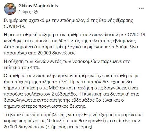 Μεγάλη ανησυχία προκάλεσε η ανάρτηση του καθηγητή Επιδημιολογίας Γκίκα Μαγιορκίνη το απόγευμα της Δευτέρας σύμφωνα με την οποία σήμερα Τρίτη (28/06) είναι λογικό να δούμε περισσότερα από 20.000 κρούσματα κορονοϊού στη χώρα μας.