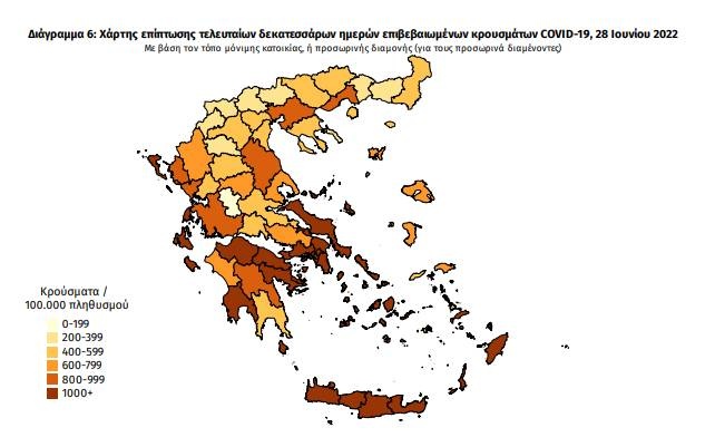 Τα στοιχεία που παρουσιάζονται αφορούν περιστατικά από την επιδημιολογική επιτήρηση της νόσου από το νέο κορονοϊό (COVID-19), με βάση τα δεδομένα που έχουν δηλωθεί στον ΕΟΔΥ και καταγραφεί μέχρι τις 28 Ιουνίου 2022 (ώρα 09:00).