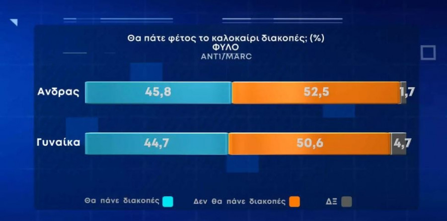 Οι μισοί πολίτες δεν σκοπεύουν να πάνε διακοπές φέτος σύμφωνα με το πρώτο μέρος της δημοσκόπησης της MARC για τον ΑΝΤ1, που παρουσιάστηκε στο κεντρικό δελτίο ειδήσεων με τον Νίκο Χατζηνικολάου.
