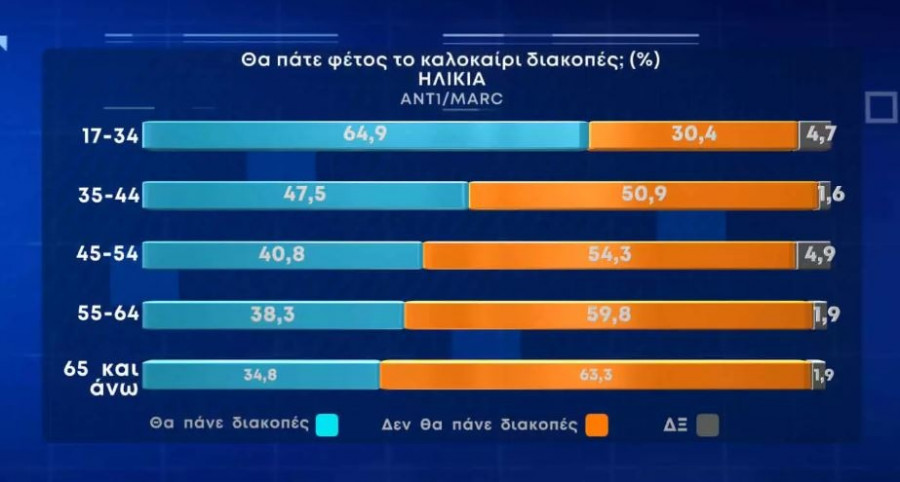 Στις ηλικιακές ομάδες οι 17-34 δηλώνουν συντριπτικά πως θα πάνε διακοπές ενώ όσο μεγαλώνουν οι ηλικίες τα ποσοστά πέφτουν και στους 65 και άνω μόλις το 34,8% δηλώνει πως θα πάει.