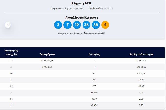 Υπενθυμίζεται ότι οι τυχεροί αριθμοί της περασμένης κλήρωσης του Τζόκερ ήταν οι: 3, 7, 19, 36, 38 και Τζόκερ ο αριθμός 5.