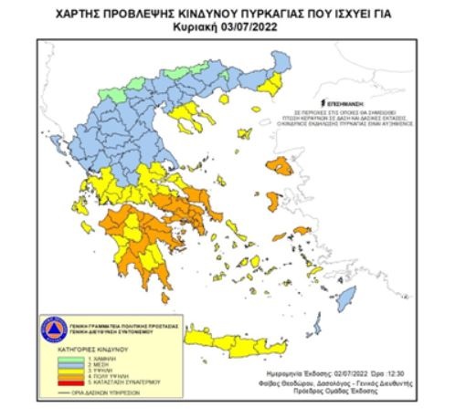 Σύμφωνα με το Χάρτη Πρόβλεψης Κινδύνου Πυρκαγιάς, που εκδίδει η Γενική Γραμματεία Πολιτικής Προστασίας, για αύριο Κυριακή 03 Ιουλίου 2022, προβλέπεται πολύ υψηλός κίνδυνος πυρκαγιάς, με κατηγορία κινδύνου 4 σε: