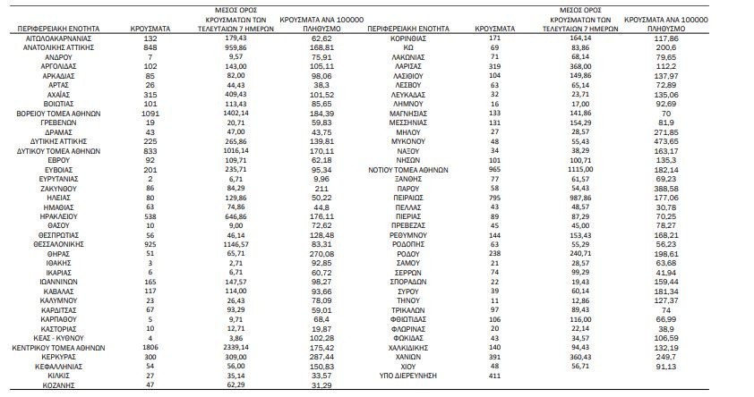 Ακολουθεί ο ημερήσιος αριθμός και κρούσματα ανά 100.000 πληθυσμού επιβεβαιωμένων εγχώριων κρουσμάτων COVID-19 ανά περιφερειακή ενότητα στις 03 Ιούλιος 2022