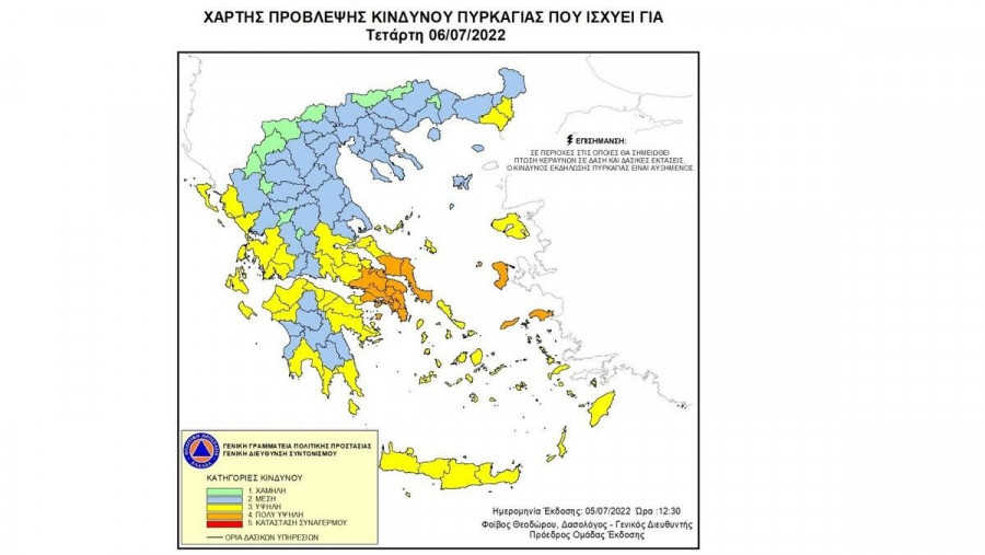 Για αύριο Τετάρτη 6 Ιουλίου 2022, προβλέπεται πολύ υψηλός κίνδυνος πυρκαγιάς (κατηγορία κινδύνου 4) για Αττική, Στερεά Ελλάδα και Βόρειο Αιγαίο