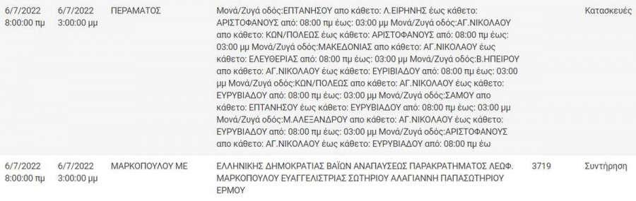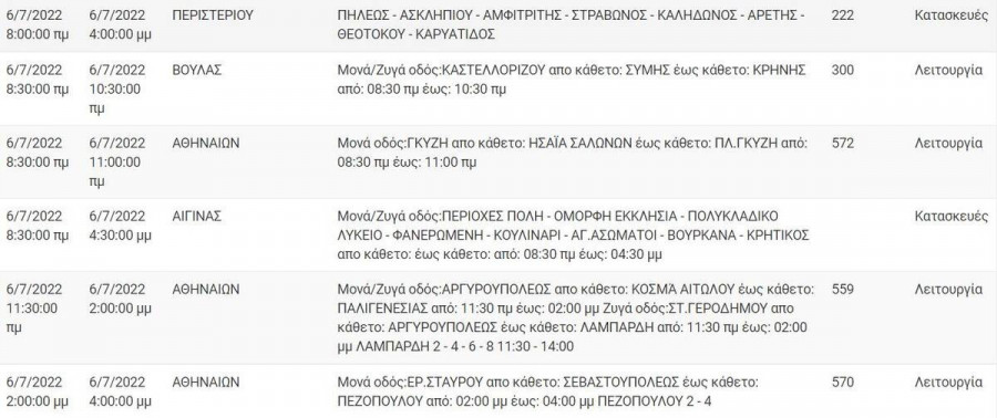 Προκειμένου να προγραμματίσετε τις εργασίες σας και να ελαχιστοποιηθεί η όχλησή σας, στον ακόλουθο πίνακα, μπορείτε να ενημερωθείτε για τις περιοχές και τις ώρες προγραμματισμένων διακοπών ηλεκτροδότησης» αναφέρει ο ΔΕΔΔΗΕ.