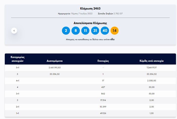 Οι τυχεροί αριθμοί της αποψινής κλήρωσης του Τζόκερ είναι οι: 2, 8, 11, 31, 40 και Τζόκερ ο αριθμός 14.