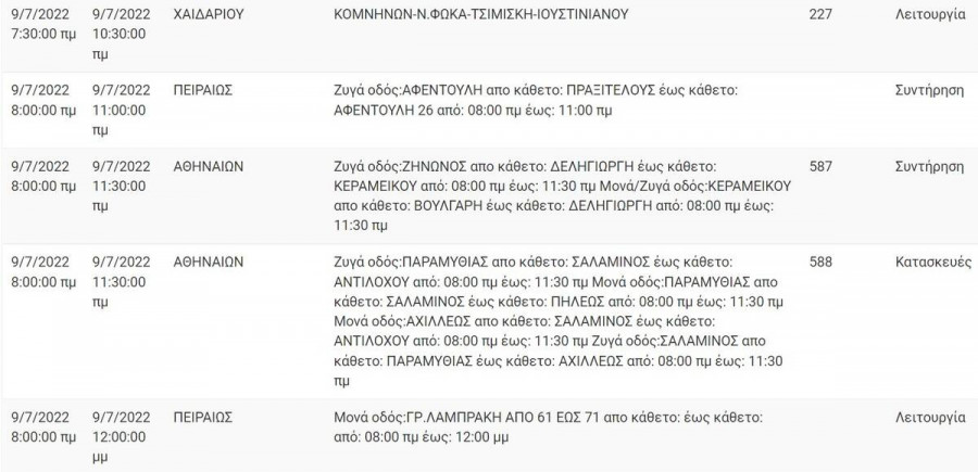 Σε πέντε περιοχές της Αττικής θα σημειωθεί σήμερα Σάββατο (9/7) προγραμματισμένη διακοπή ρεύματος, σύμφωνα με ανακοίνωση του ΔΕΔΔΗΕ.