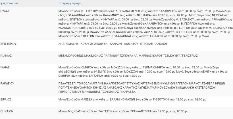 15/7/2022 8:00:00 πμ | 15/7/2022 2:00:00 μμ | ΒΟΥΛΑΣ | Μονά/Ζυγά οδός:Β. ΓΕΩΡΓΙΟΥ απο κάθετο: Λ. ΒΟΥΛΙΑΓΜΕΝΗΣ έως κάθετο: ΚΑΛΑΒΡΥΤΩΝ από: 08:00 πμ έως: 02:00 μμ Μονά/Ζυγά οδός:ΚΕΦΑΛΛΗΝΙΑΣ απο κάθετο: ΚΑΛΥΜΝΟΥ έως κάθετο: ΝΙΚΗΤΑΡΑ από: 08:00 πμ έως: 02:00 μμ Μονά/Ζυγά οδός:ΝΕΜΕΑΣ απο κάθετο: ΣΠΕΤΣΩΝ έως κάθετο: ΝΙΚΗΤΑΡΑ από: 08:00 πμ έως: 02:00 μμ Μονά/Ζυγά οδός:Μ. ΒΑΣΙΛΕΙΟΥ απο κάθετο: ΑΡΚΑΔΙΟΥ έως κάθετο: ΝΙΚΗΤΑΡΑ από: 08:00 πμ έως: 02:00 μμ Μονά/Ζυγά οδός:ΚΑΛΑΒΡΥΤΩΝ απο κάθετο: Β. ΓΕΩΡΓΙΟΥ έως κάθετο: ΚΟΛΟΚΟΤΡΩΝΗ από: 08:00 πμ έως: 02:00 μμ Μονά/Ζυγά οδός:ΚΑΛΥΜΝΟΥ απο κάθετο: Β. ΓΕΩΡΓΙΟΥ έως κάθετο: Μ. ΒΑΣΙΛΕΙΟΥ από: 08:00 πμ έως: 02:00 μμ Μονά/Ζυγά οδός:ΑΡΚΑΔΙΟΥ απο κάθετο: ΑΧΙΛΛΕΩΣ έως κάθετο: Β. ΓΕΩΡΓΙΟΥ από: 08:00 πμ έως: 02:00 μμ Μονά/Ζυγά οδός:ΣΠΕΤΣΩΝ απο κάθετο: ΚΕΦΑΛΛΗΝΙΑΣ έως κάθετο: ΑΧΙΛΛΕΩΣ από: 08:00 πμ έως: 02:00 μμ Μονά |