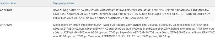 Μονά οδός:ΠΡΑΤΙΝΟΥ απο κάθετο: ΔΟΥΡΙΔΟΣ έως κάθετο: ΣΤΡΑΒΩΝΟΣ από: 05:00 μμ έως: 07:00 μμ Ζυγά οδός:ΠΡΑΤΙΝΟΥ απο κάθετο: ΣΤΡΑΒΩΝΟΣ έως κάθετο: ΕΡΙΦΥΛΗΣ από: 05:00 μμ έως: 07:00 μμ Μονά/Ζυγά οδός:ΣΤΡΑΒΩΝΟΣ απο κάθετο: ΠΡΑΤΙΝΟΥ έως κάθετο: ΑΣΤΥΔΑΜΑΝΤΟΣ από: 05:00 μμ έως: 07:00 μμ Ζυγά οδός:ΑΣΤΥΔΑΜΑΝΤΟΣ απο κάθετο: ΣΤΡΑΒΩΝΟΣ έως κάθετο: ΕΡΙΦΥΛΗΣ από: 05:00 μμ έως: 07:00 μμ Μονά οδός:ΣΤΡΑΒΩΝΟΣ Νο 21 - 23 - 25 από: 05:00 μμ έως: 07:00 μμ