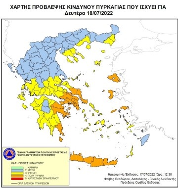 Σύμφωνα με το Χάρτη Πρόβλεψης Κινδύνου Πυρκαγιάς που εξέδωσε η Γενική Γραμματεία Πολιτικής Προστασίας του Υπουργείου Κλιματικής Κρίσης & Πολιτικής Προστασίας, για αύριο Δευτέρα 18 Ιουλίου 2022, προβλέπεται πολύ υψηλός κίνδυνος πυρκαγιάς (κατηγορία κινδύνου 4) για τις εξής περιοχές: