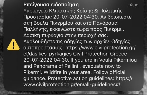 Στις 04:30 τα ξημερώματα της Τετάρτης ακόμα ένα μήνυμα του 112 εστάλη προς τους κατοίκους στο Πανόραμα Παλλήνης και στη Βουλα Πικερμίου, προκειμένου να εκκενώσουν προς Πικέρμι.