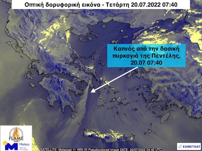 Οπτική δορυφορική εικόνα από τη μεγάλη φωτιά στην Πεντέλη, δημοσίευσε το Εθνικό Αστεροσκοπείο Αθηνών/meteo.gr από τον Ευρωπαϊκό δορυφόρο METEOSAT-11, που δείχνει τον καπνό της δασικής πυρκαγιάς της Πεντέλης να έχει μεταφερθεί από τους ισχυρούς βόρειους-βορειοανατολικούς ανέμους τουλάχιστον 400 χιλιόμετρα νότια-νοτιοδυτικά προς την θάλασσα των Κυθήρων και το Νοτιοδυτικό Κρητικό Πέλαγος το πρωί της Τετάρτης 20.07.2022 07:40.