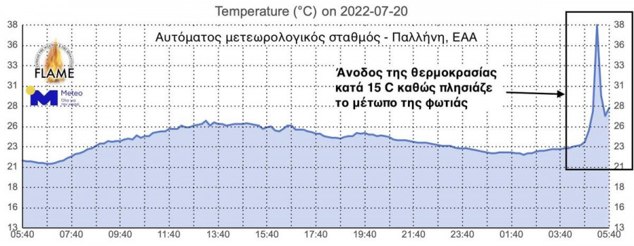 Από τις καταγραφές του αυτόματου μετεωρολογικού σταθμού του ΕΑΑ / meteo.gr στην Παλλήνη, προκύπτει απότομη άνοδος της θερμοκρασίας κατά 15 βαθμούς Κελσίου την ώρα που το μέτωπο της φωτιάς πλησίαζε την περιοχή. Ειδικότερα, η θερμοκρασία μεταξύ 04:40 και 05:10 (20.07.2022), εντός δηλαδή 30 λεπτών, ανέβηκε από τους 23 στους 38 βαθμούς Κελσίου (Εικόνα 2).