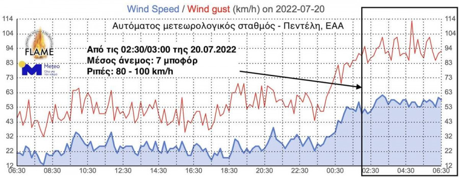 Με βάση το δίκτυο αυτόματων μετεωρολογικών σταθμών του ΕΑΑ / meteo.gr, αλλά και όπως είχε επισημανθεί σε προηγούμενη ανακοίνωση, οι βόρειοι άνεμοι στην περιοχή της πυρκαγιάς ενισχύθηκαν σημαντικά από τις πρώτες πρωινές ώρες (02:30/03:00) της Τετάρτης 20.07.2022, πνέοντας μέχρι αυτή τη στιγμή (20.07.2022, 07:00) με μέσες εντάσεις που φτάνουν τα 7 μποφόρ και ριπές που ξεπερνούν τα 90-100 km/h (Εικόνα 1).