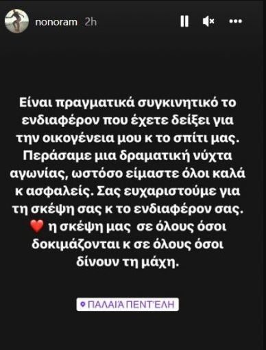 Συγκεκριμένα, η Ελεονώρα Μελέτη έκανε ανάρτηση στον προσωπικό της λογαριασμό στο Instagram, στον οποίο έγραψε: «Είναι πραγματικά συγκινητικό το ενδιαφέρον που έχετε δείξει για την οικογένειά μου και το σπίτι μας. Περάσαμε μια δραματική νύχτα, ωστόσο είμαστε όλοι καλά και ασφαλείς. Σας ευχαριστούμε για τη σκέψη σας και το ενδιαφέρον σας. Η σκέψη μας σε όλους, όσοι δοκιμάζονται και σε όλους, όσοι δίνουν τη μάχη».