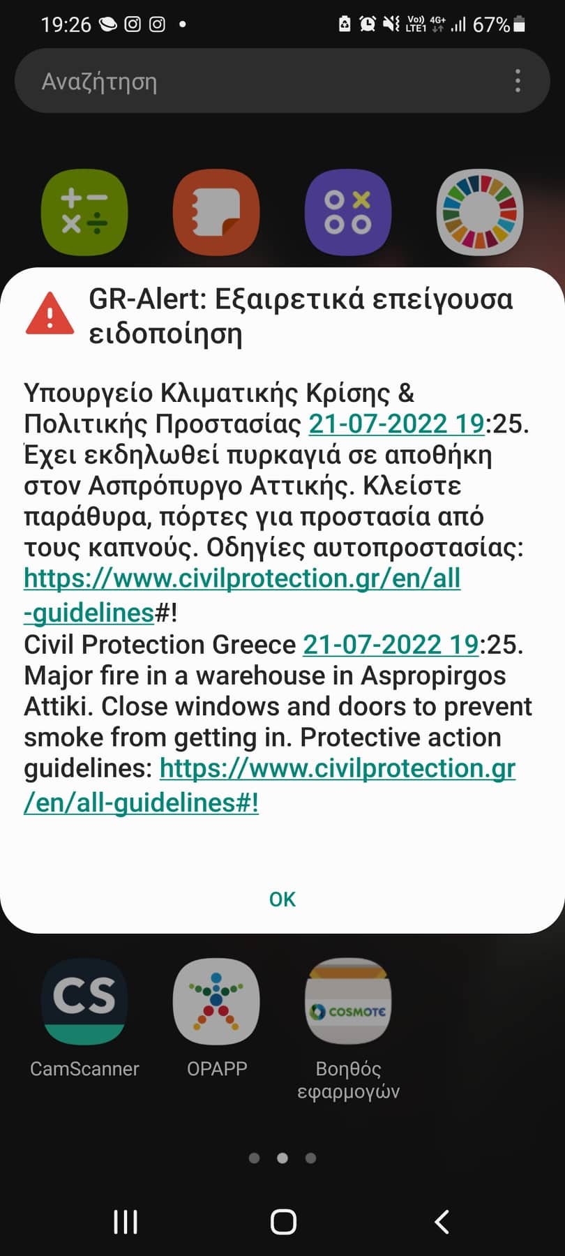 Η κατάσταση έχει γίνει αποπνικτική, με την Πολιτική Προστασία να στέλνει άμεσα μήνυμα προς τους κατοίκους μέσω του 112 για προφύλαξη από τους καπνούς σε ακτίνα τουλάχιστον τριών χιλιομέτρων, ζητώντας να κλείσουν πόρτες και παράθυρα.