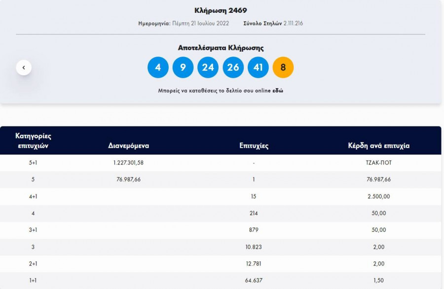 Αξίζει να σημειωθεί ότι από την κλήρωση αναδείχθηκε ένα τυχερό δελτίο στην δεύτερη κατηγορία (5αρια) που κερδίζει το ποσό των 76.987,66 ευρώ!