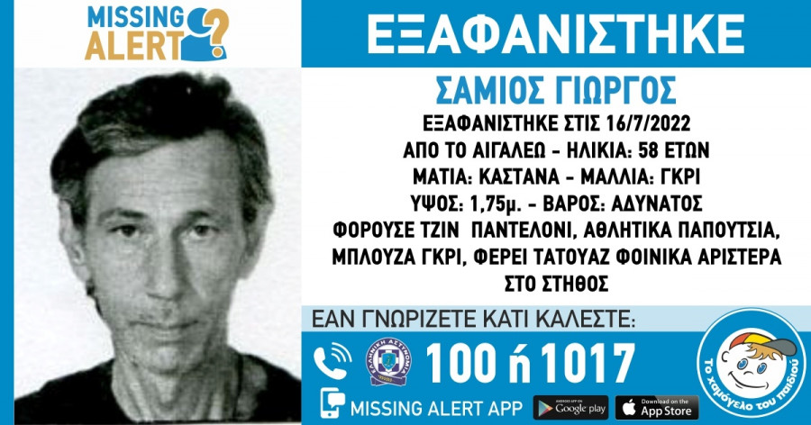 Στις 16/07/2022, εξαφανίστηκε από την περιοχή του Αιγάλεω, ο Σάμιος Γεώργιος, 58 ετών.