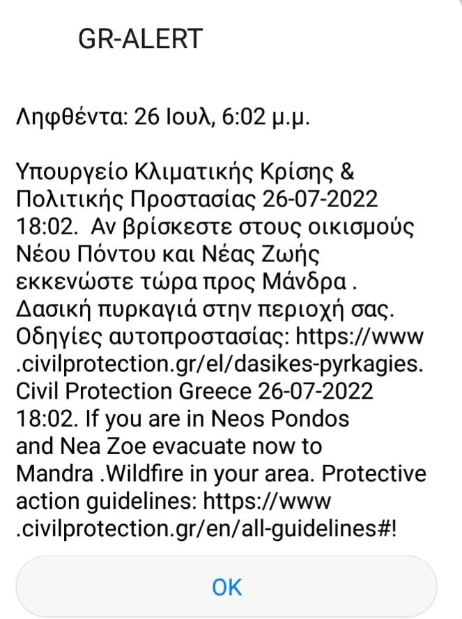 Επίσης, δόθηκε εντολή για εκκένωση στους οικισμούς Νέα Ζωή και Νέος Πόντος προς Μάνδρα.