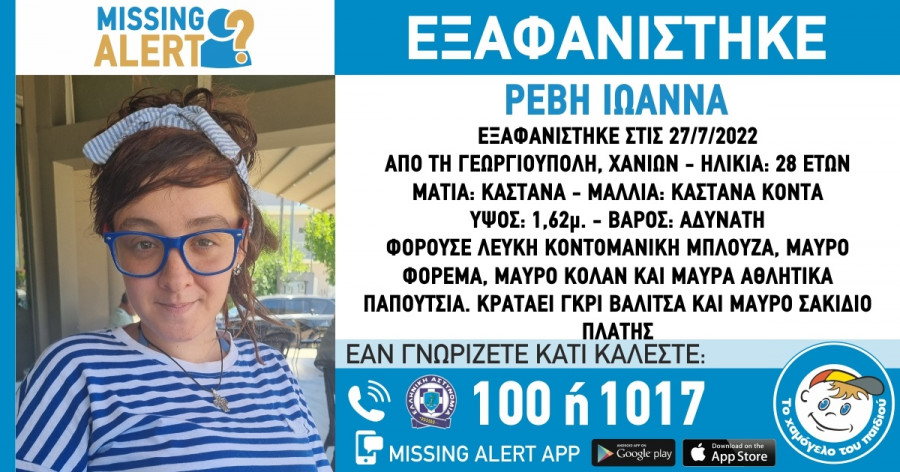 Στις 27//07/2022, απογευματινές ώρες, εξαφανίστηκε από την περιοχή της Γεωργιούπολης Χανίων, η Ιωάννα Ρέβη, 28 ετών.