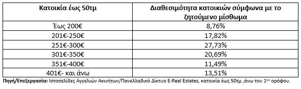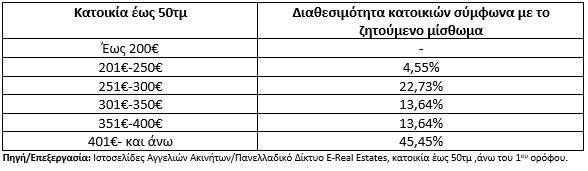 Σύμφωνα με τις αναρτημένες αγγελίες σε ιστοσελίδες ακινήτων, στις περιοχές του κέντρου των Αθηνών, οι κατοικίες άνω του 1ου ορόφου έως 50τμ που διατίθενται με ζητούμενο μίσθωμα έως 300€, αποτελούν μόλις το 12,47% (κυρίως γκαρσονιέρες 21τμ-30τμ) επί του συνόλου των διαθέσιμων προς μίσθωση κατοικιών άνω του 1ου ορόφου έως 50τμ. Δηλαδή 1 στις 10 κατοικίες κατάλληλες για φοιτητές διατίθενται με μίσθωμα έως 300€ στην Αθήνα.