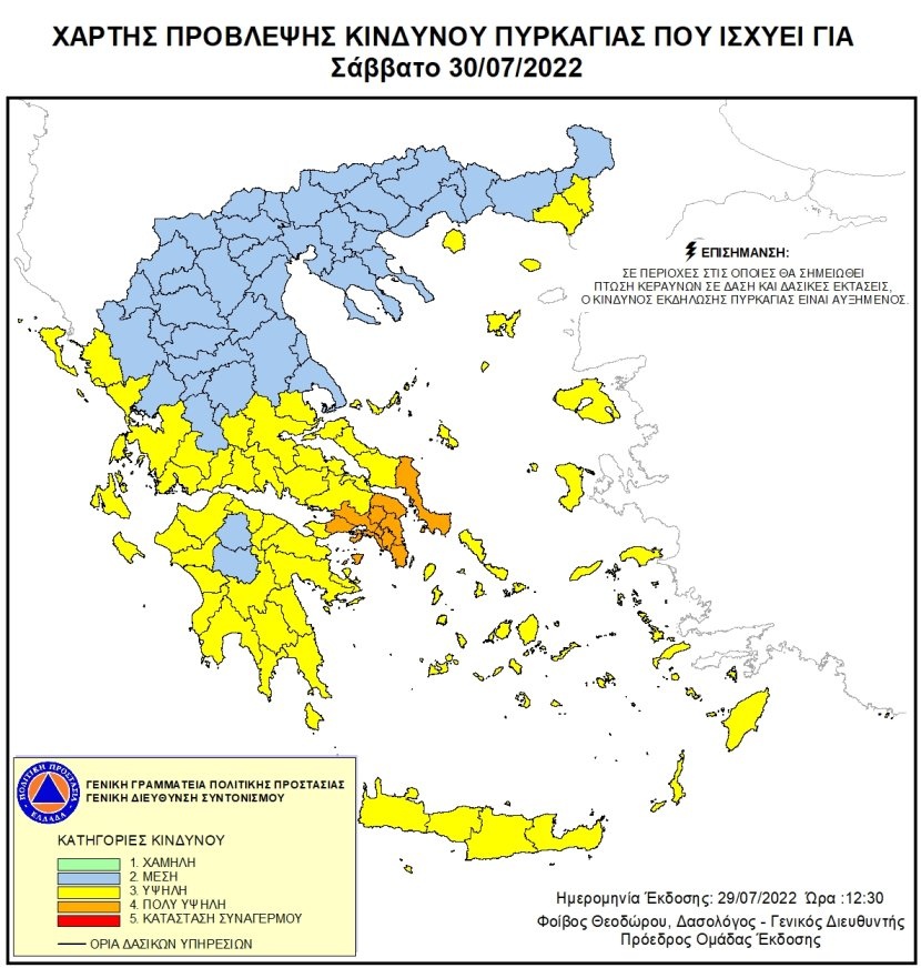 Πολύ υψηλός κίνδυνος πυρκαγιάς (κατηγορία κινδύνου 4) προβλέπεται αύριο, Σάββατο 30 Ιουλίου, για την Περιφέρεια Αττικής και την Περιφέρεια Στερεάς Ελλάδας (ΠΕ Εύβοιας), σύμφωνα με τον Χάρτη Πρόβλεψης Κινδύνου Πυρκαγιάς που εκδίδει η Γενική Γραμματεία Πολιτικής Προστασίας του Υπουργείου Κλιματικής Κρίσης & Πολιτικής Προστασίας (www.civilprotection.gr).