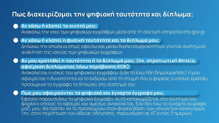Εάν ο πολίτης δηλώσει την απώλεια της αστυνομικής του ταυτότητας είτε αυτοπροσώπως σε ένα αστυνομικό τμήμα είτε μέσω του gov.gr, τότε αυτόματα και άμεσα οποιοδήποτε ψηφιακό αντίγραφο έχει εκδοθεί ακυρώνεται. Το ίδιο ισχύει και εάν ο πολίτης δηλώσει την απώλεια του διπλώματος οδήγησης σε ένα αστυνομικό τμήμα, σε ένα ΚΕΠ ή στη Διεύθυνση Μεταφορών της αρμόδιας Περιφέρειας.