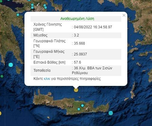 Το επίκεντρο του σεισμού εντοπίζεται 36 Χλμ. ΒΒΑ των Σισών Ρεθύμνου.