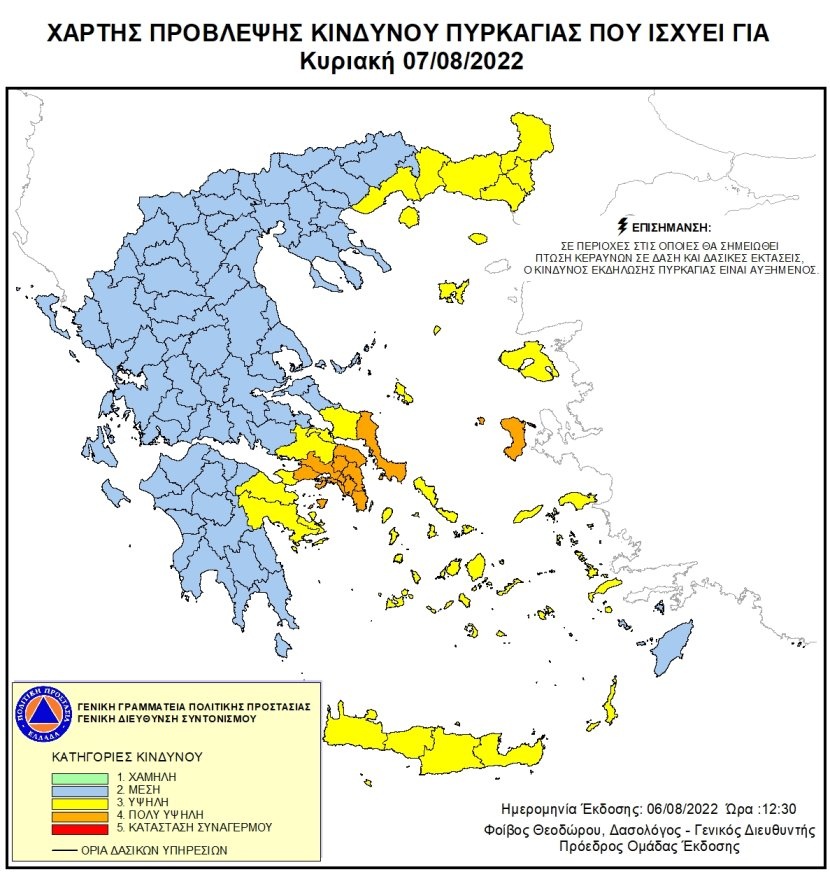 Σύμφωνα με το Χάρτη Πρόβλεψης Κινδύνου Πυρκαγιάς που εκδίδει η Γενική Γραμματεία Πολιτικής Προστασίας του Υπουργείου Κλιματικής Κρίσης & Πολιτικής Προστασίας (www.civilprotection.gr), για αύριο Κυριακή 07 Αυγούστου 2022, προβλέπεται πολύ υψηλός κίνδυνος πυρκαγιάς (κατηγορία κινδύνου 4) για τις εξής περιοχές: