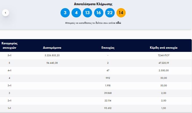 Στην πρώτη κατηγορία δεν αναδείχθηκε κανένας νικητής, με αποτέλεσμα να σημειωθεί τζακ ποτ, ενώ στη δεύτερη υπήρξαν δύο τυχεροί που θα πάρουν από 47.220,19 ευρώ.