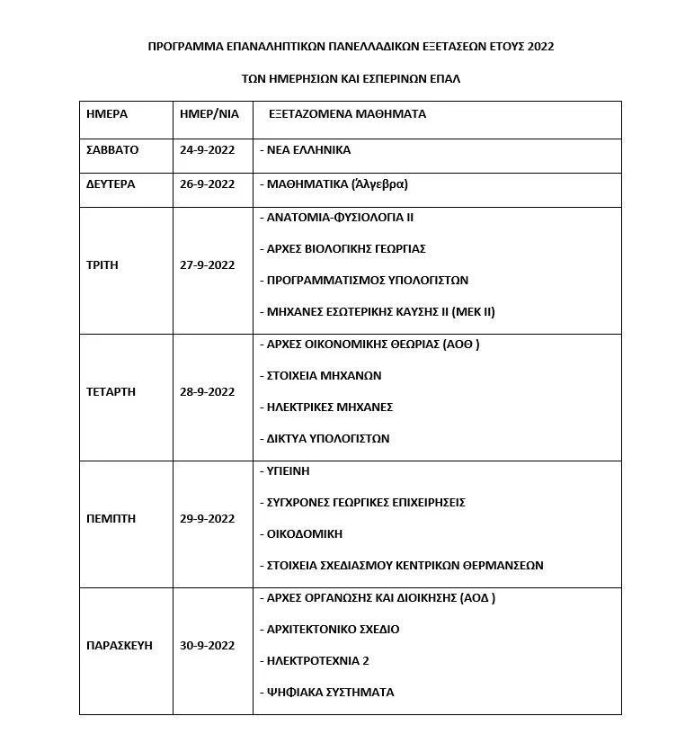 Ανακοινοποίηση του προγράμματος διεξαγωγής των επαναληπτικών πανελλαδικών εξετάσεων ΕΠΑΛ των μαθημάτων γενικής παιδείας και ειδικότητας Γ' τάξης ημερήσιων και Γ' τάξης εσπερινών ΕΠΑΛ, έτους 2022 με την προσθήκη του μαθήματος ΣΤΟΙΧΕΙΑ ΣΧΕΔΙΑΣΜΟΥ ΚΕΝΤΡΙΚΩΝ ΘΕΡΜΑΝΣΕΩΝ την Πέμπτη 29-9-2022: Ως ώρα έναρξης εξέτασης ορίζεται για όλα τα μαθήματα η 16:00.