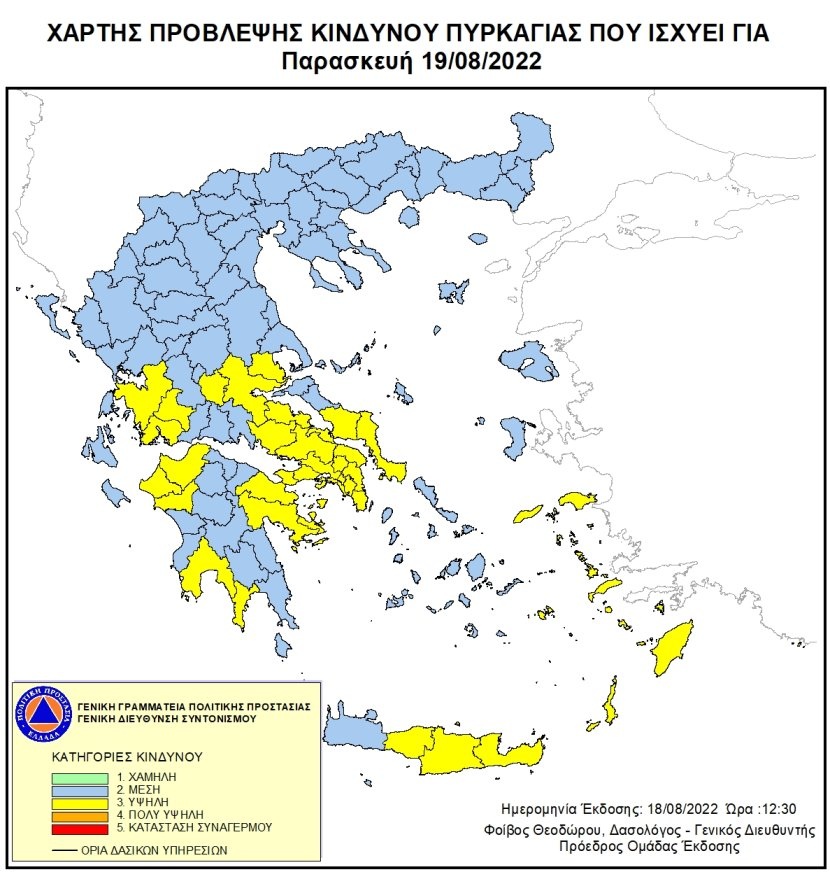 Παράλληλα στην ανακοίνωση της Πυροσβεστικής αναφέρεται ότι σύμφωνα με το Χάρτη Πρόβλεψης Κινδύνου Πυρκαγιάς που εκδίδει η Γενική Γραμματεία Πολιτικής Προστασίας του Υπουργείου Κλιματικής Κρίσης & Πολιτικής Προστασίας (www.civilprotection.gr), για αύριο, Παρασκευή 19 Αυγούστου 2022, προβλέπεται υψηλός κίνδυνος πυρκαγιάς (κατηγορία κινδύνου 3) σε: Αττική, Βοιωτία, Φθιώτιδα, Εύβοια και Μαγνησία, αρκετές περιοχές της Πελοποννήσου, της Δυτικής Ελλάδας και της Κρήτης καθώς και σε Δωδεκάνησα, Σάμο και Ικαρία.