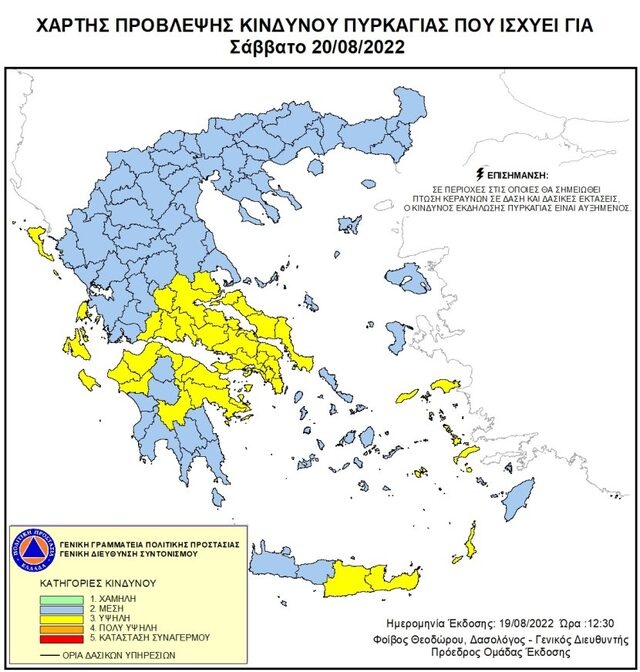 Σύμφωνα με το Χάρτη Πρόβλεψης Κινδύνου Πυρκαγιάς που εκδίδει η Γενική Γραμματεία Πολιτικής Προστασίας του Υπουργείου Εσωτερικών και Διοικητικής Ανασυγκρότησης, για σήμερα Σάββατο 20 Αυγούστου, προβλέπεται υψηλός κίνδυνος πυρκαγιάς (κατηγορία κινδύνου 3).