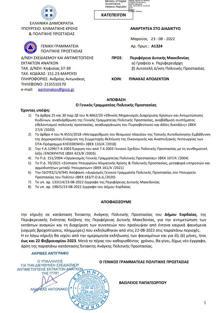 Την κήρυξη σε κατάσταση Έκτακτης Ανάγκης Πολιτικής Προστασίας του Δήμου Εορδαίας, της ΠΕ Κοζάνης αποφάσισε ο Γενικός Γραμματέας Πολιτικής Προστασίας Βασίλειος Παπαγεωργίου, για την αντιμετώπιση των εκτάκτων αναγκών και τη διαχείριση των προβλημάτων που προέκυψαν από τη σφοδρή καταιγίδα που έπληξε το βράδυ της Δευτέρας την περιοχή.