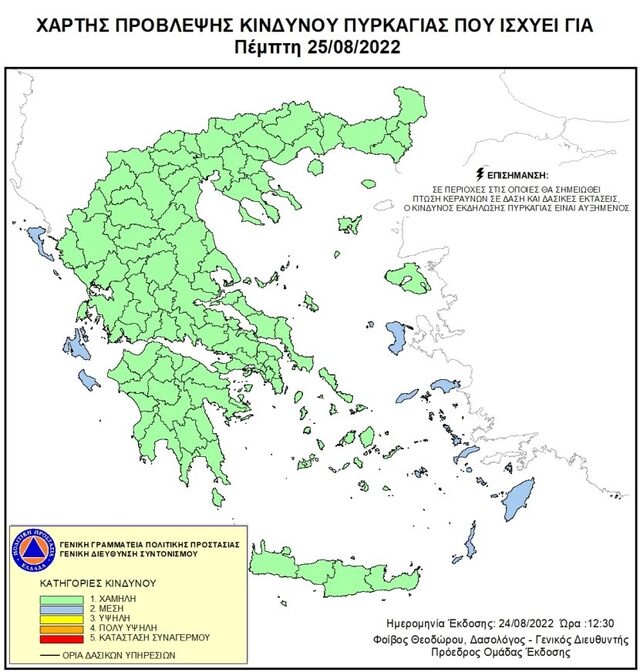 Σύμφωνα με το Χάρτη Πρόβλεψης Κινδύνου Πυρκαγιάς που εκδίδει η Γενική Γραμματεία Πολιτικής Προστασίας του Υπουργείου Εσωτερικών και Διοικητικής Ανασυγκρότησης, για σήμερα Πέμπτη 25 Αυγούστου, προβλέπεται μέσος κίνδυνος πυρκαγιάς (κατηγορία κινδύνου 2).