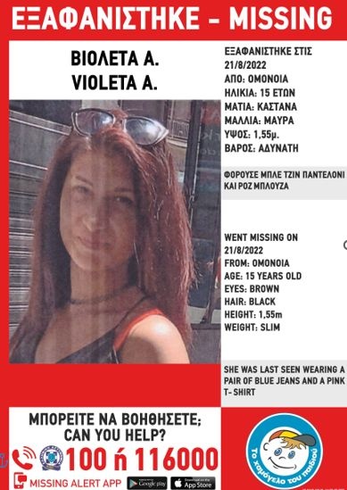 Στις 21/08/2022, εξαφανίστηκε από την περιοχή της Ομόνοιας, η Βιολέτα Α., 15 ετών.