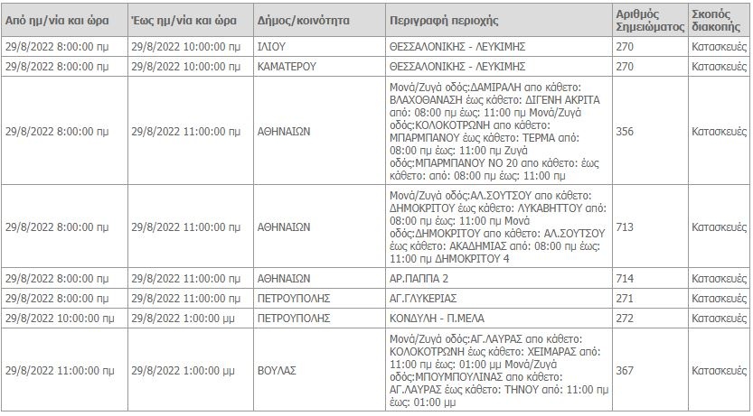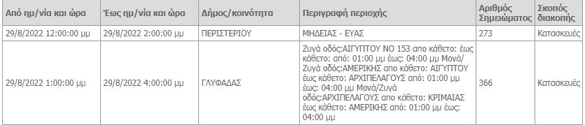 Σύμφωνα με την ΔΕΔΔΗΕ οι έξι περιοχές της Αττικής που αναμένεται να υπάρξουν διακοπές ρεύματος είναι: