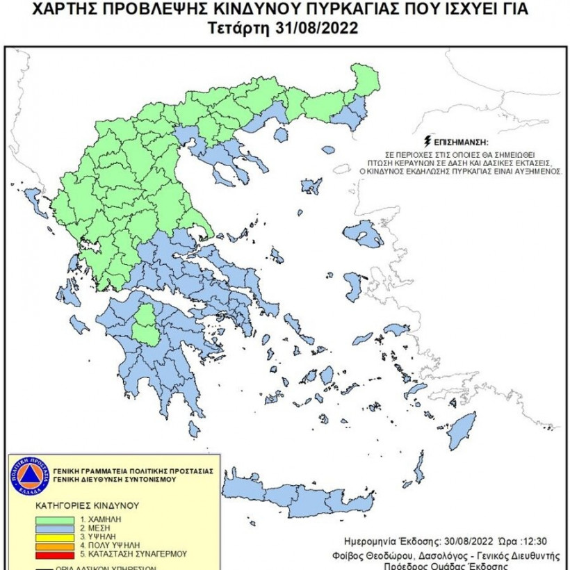 Ο κίνδυνος είναι χαμηλός. Η πιθανότητα για εκδήλωση πυρκαγιάς δεν είναι ιδιαίτερα υψηλή. Εάν εκδηλωθεί πυρκαγιά, οι συνθήκες (κατάσταση καύσιμης ύλης, μετεωρολογικές συνθήκες) δεν θα ευνοήσουν τη γρήγορη εξέλιξή της.