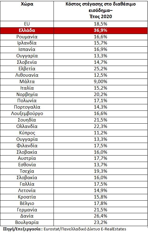 Ο Πρόεδρος Πανελλαδικού Δικτύου E-Real Estates τόνισε πως «ένας άλλος τρόπος για να δούμε αν η στέγαση είναι προσιτή είναι με το μερίδιο του κόστους στέγασης στο συνολικό διαθέσιμο εισόδημα. Κατά μέσο όρο στην ΕΕ το 2020, το 18,5 % του διαθέσιμου εισοδήματος αφιερώθηκε στο κόστος στέγασης. Αυτό διέφερε μεταξύ των κρατών μελών, με τα υψηλότερα ποσοστά στην Ελλάδα (36,9 %), τη Γερμανία (21,5 %) και τη Δανία (26,4 %).
