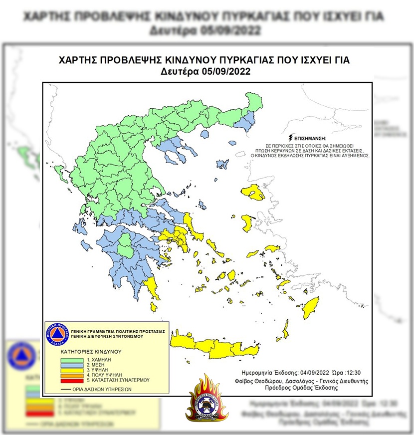 Χάρτης Πρόβλεψης Κινδύνου Πυρκαγιάς για αύριο Δευτέρα 5/9