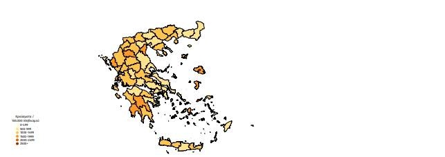 Γεωγραφική διασπορά: Ο χάρτης αποτυπώνει τη γεωγραφική κατανομή των κρουσμάτων COVID-19 των τελευταίων 14 ημερών ανά Περιφερειακή Ενότητα της χώρας, με βάση την δηλωθείσα διεύθυνση μόνιμης κατοικίας του ασθενούς, ή τη διεύθυνση προσωρινής διαμονής για τους τουρίστες και άλλους προσωρινά διαμένοντες στην Ελλάδα. Συμπεριλαμβάνονται τόσο κρούσματα με ιστορικό ταξιδιού (“εισαγόμενα”) όσο και κρούσματα με πιθανή εγχώρια μετάδοση.