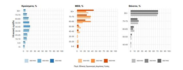 Η διάμεση ηλικία των κρουσμάτων είναι 38 έτη, ενώ η διάμεση ηλικία των θανόντων είναι 80 έτη. Στο Διάγραμμα 5 παρουσιάζεται το ποσοστό ανά ηλικιακή ομάδα των κρουσμάτων, νοσηλευόμενων στις MEΘ και ασθενών που απεβίωσαν τις τελευταίες τρεις εβδομάδες.