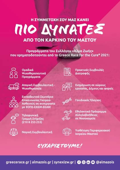 Ο Πανελλήνιος Σύλλογος Γυναικών με Καρκίνο Μαστού «Άλμα Ζωής» σας προσκαλεί την Κυριακή 2 Οκτωβρίου στο Greece Race for the Cure® 2022, συμβολικό αγώνα δρόμου και περίπατο ενάντια στον καρκίνο του μαστού, που θα πραγματοποιηθεί για 14η χρονιά σε συνδιοργάνωση με τον Οργανισμό Πολιτισμού, Αθλητισμού και Νεολαίας Δήμου Αθηναίων (ΟΠΑΝΔΑ).