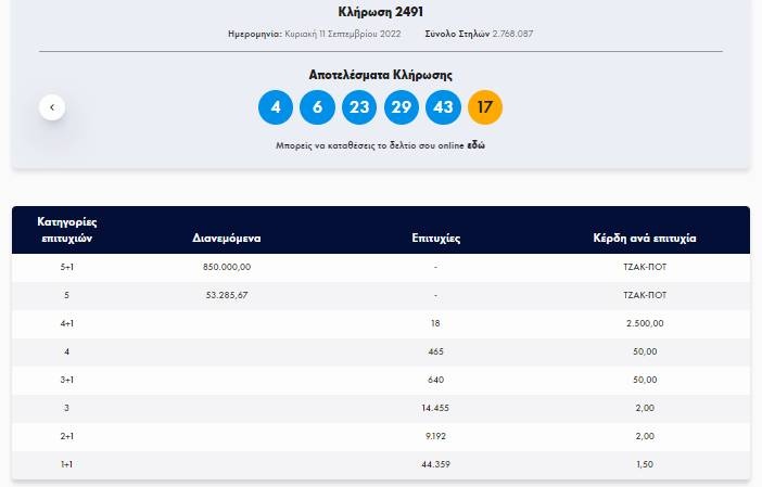 Αξίζει να σημειωθεί ότι από την αποψινή κλήρωση τζακ ποτ είχε και στην δεύτερη κατηγορία (5αρια) ενώ στην τρίτη βρέθηκαν 18 επιτυχημένα δελτία που κερδίζουν το ποσό των 2.500,00 ευρώ!