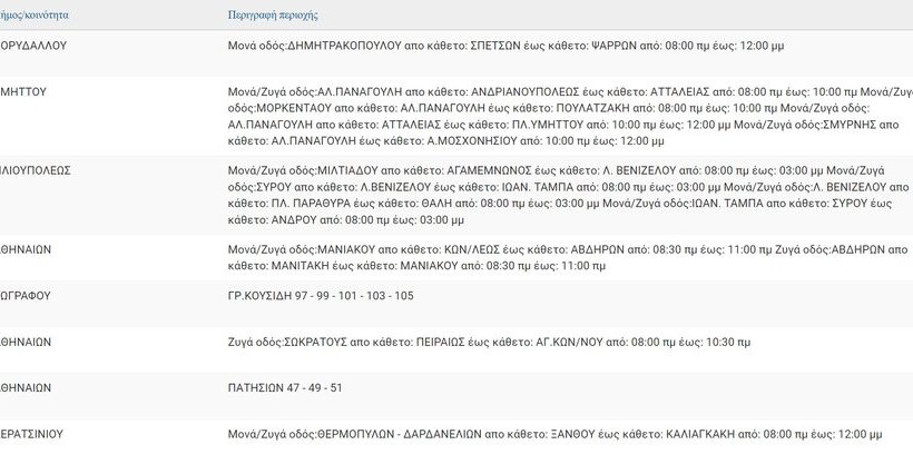 Από ημ/νία και ώρα | Έως ημ/νία και ώρα | Δήμος/κοινότητα | Περιγραφή περιοχής | Αριθμός Σημειώματος | Σκοπός διακοπής |